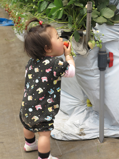 この子は7ヶ月から歩けるようになり、今回の苺狩りも自由自在に動きまわり、目の高さに素晴らしいものがぶら下がっている事にニコニコ^^