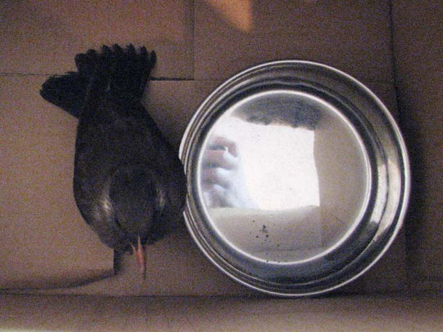結果。事務所に持っていき、上記のようにダンボールへそっと入れ、鳥も水を飲むのか!?どのようにして飲むのかも良く解らず^^; 我が家のワンコの水のみ皿を添えて、入り口の外へ置いておきました。