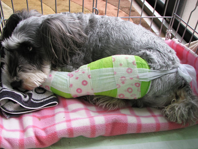 犬は足の太さが付け根から先まで大分る異なる為、どうしても固定が寝返りやおしっこの際にずれてしまい、何度も包帯の巻き直しが必要とのことです。